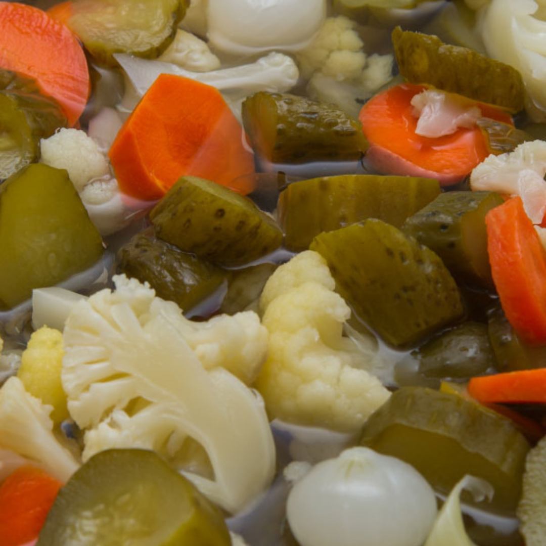 Los pickles son encurtidos y son alimentos conservados en un ambiente ácido para extender su conservación. Este pickle lleva pepinillos, zanahorias, cebolla perla.